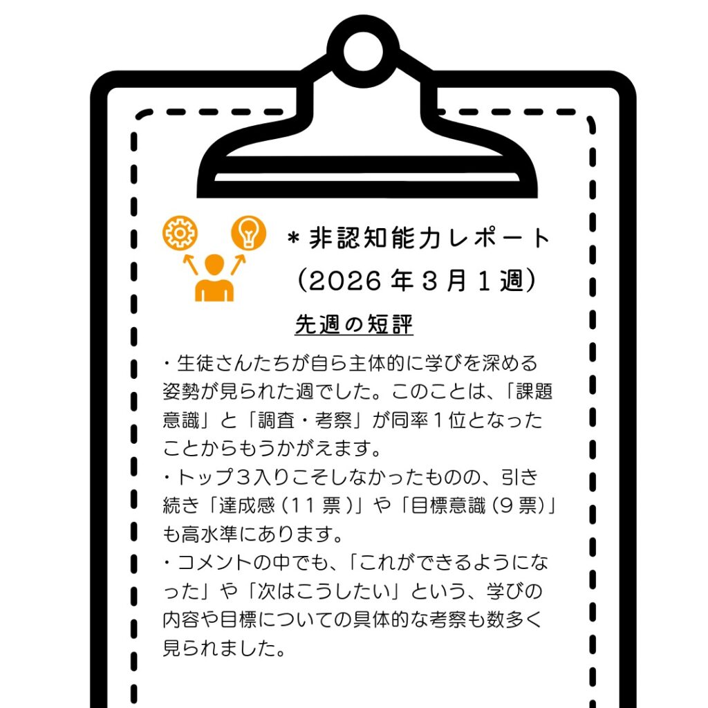 この「非認知能力レポート」は、授業のふりかえりデータを集計し、生徒さんがどのようなことを意識して学習していたかをお知らせするものです。