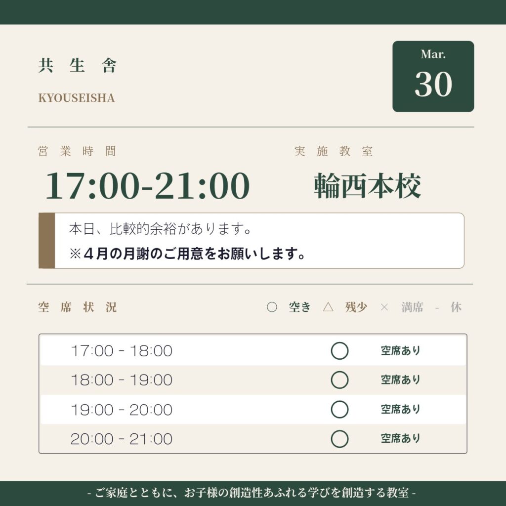 20260330 営業予定 投稿者: murokyousei2026年3月30日News、お知らせ、営業情報 2026.3.30(月) 本日の営業予定を掲示いたします。 【教室】輪西町2丁目 輪西本校 【時間】17:00~21:00 【諸連絡】・本日、比較的余裕があります。・4月の月謝のご用意をお願い致します。 ・新学期生募集中。 ご見学、ご相談随時承ります! FacebookXBlueskyCopy